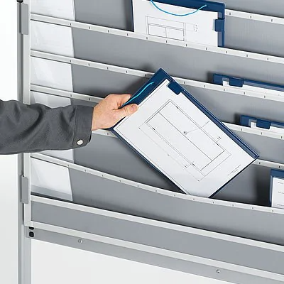 Dubbelzijdig te gebruiken: aan de voorzijde 9 verzonken rijen voor het overzichtelijk opbergen van DIN A4 werkorders of werkorderhoezen.